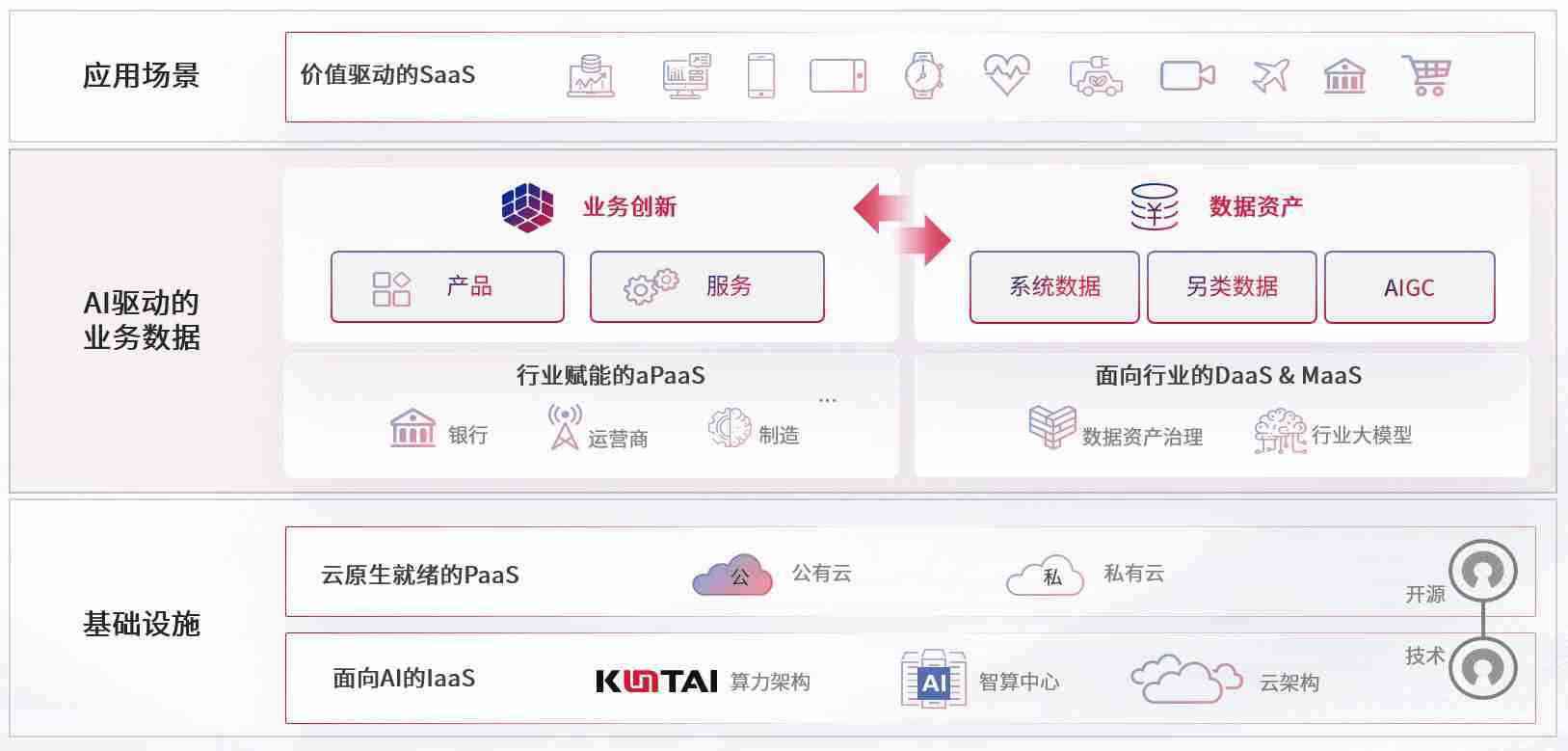 数字时代,,,,围绕企业数字化转型的关键要素,,,,狗子28数码开创性的提出数云融合战略和技术体系框架,,,着力在云原生、、数字原生、、AI原生和信创产业上架构产品和服务能力,,,为处在不同数字化转型阶段的快消零售、、、汽车、、、、金融、、、、医疗、、、、政企、、、、教育、、、、运营商等行业客户提供泛在的敏捷IT能力和融合的数据驱动能力,,,构建跨界融合创新的数字业务场景和新业务模式,,,助力企业级客户建立面向未来的核心能力和竞争优势,,,,全面推动社会的数字化、、智能化转型升级。。。