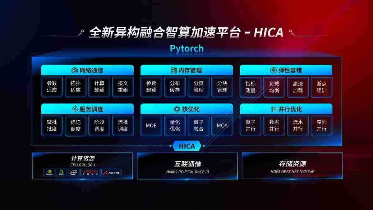 通过自研的服务层、、、中间适配层、、、以及调度编排算法,,,采用数据并行、、、模型并行等多种并行方式,,,把并行计算任务进行有效的分解,,,,使其分别由相应的软件栈和算力资源来承接。。。。当GPU资源变化,,,,HICA可以实时动态调度计算子任务并调整模型拓扑和架构,,以充分聚合各种算力资源。。。。